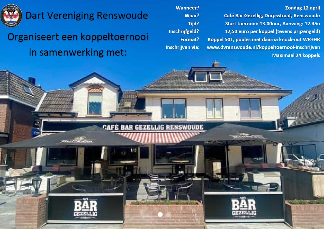 Hier kun je je inschrijven voor het 10e koppeltoernooi van de DV Renswoude. Het toernooi zal plaatsvinden op zondag 12 april 2026 om 13:00 uur in café Bar Gezellig. Het inschrijfgeld bedraagt 12,50 Euro per koppel en er is een maximum aantal koppels van 24 wat zich kan inschrijven. Inschrijfgeld is prijzengeld.